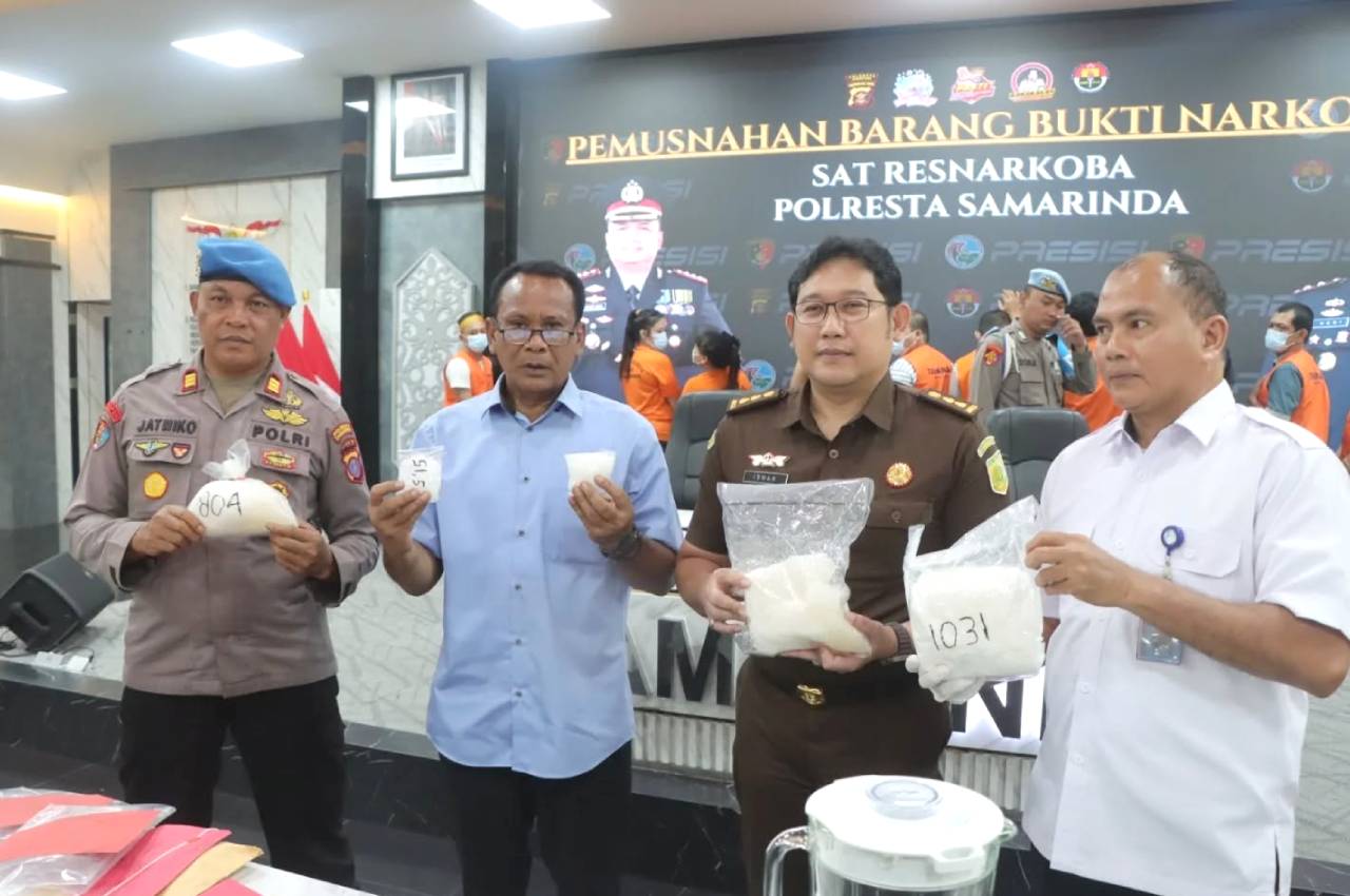 6 kilogram sabu dan ribuan gram ekstasi dimusnahkan Polresta Samarinda di Aula Rupatama Polresta Samarinda, Rabu (28/5/2025). Dok. Polda KaltimSamarinda – Satuan Reserse Narkoba (Satresnarkoba) Polresta Samarinda melakukan pemusnahan narkoba dalam jumlah besar yang melibatkan berbagai jenis barang bukti hasil penyidikan.