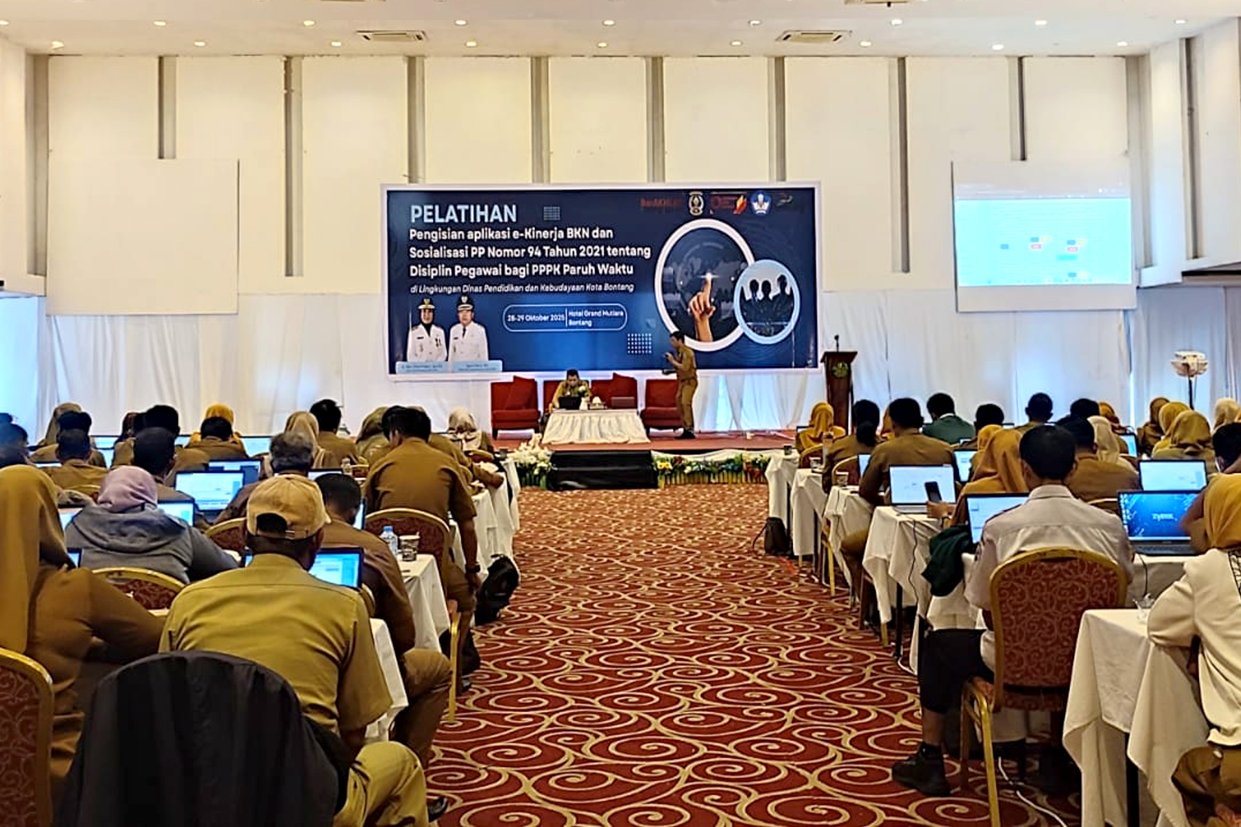 Suasana Pelatihan Pengisian Aplikasi e-Kinerja BKN serta Sosialisasi Peraturan Pemerintah (PP) Nomor 94 Tahun 2021 tentang Disiplin Pegawai bagi Pegawai Pemerintah dengan P3K paruh waktu, Rabu (29/10/2025).BONTANG – Dinas Pendidikan dan Kebudayaan (Disdikbud) Kota Bontang menggelar Pelatihan Pengisian Aplikasi e-Kinerja BKN serta Sosialisasi Peraturan Pemerintah (PP) Nomor 94 Tahun 2021 tentang Disiplin Pegawai bagi Pegawai Pemerintah dengan Perjanjian Kerja (PPPK) paruh waktu, Rabu (29/10/2025).