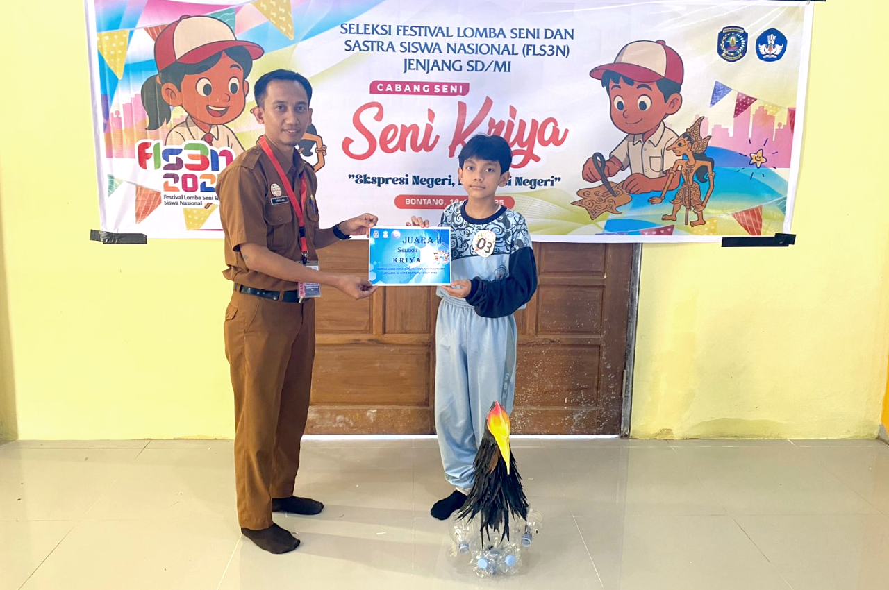Sayyid Ukir (kanan), siswa SD Negeri 001 Bontang Selatan saat menrima piagam juara 2 Lomba Kriya di ajang FLS2N, Tingkat Kota. (Foto: Nur/Memonesia.com)BONTANG – Sayyid Fatir Al Hasan, siswa SD Negeri 001 Bontang Selatan, yang berhasil menorehkan prestasi yang membanggakan, dalam ajang Festival dan Lomba Seni Siswa Nasional (FLS2N) cabang Kriya, tingkat Kota Bontang.