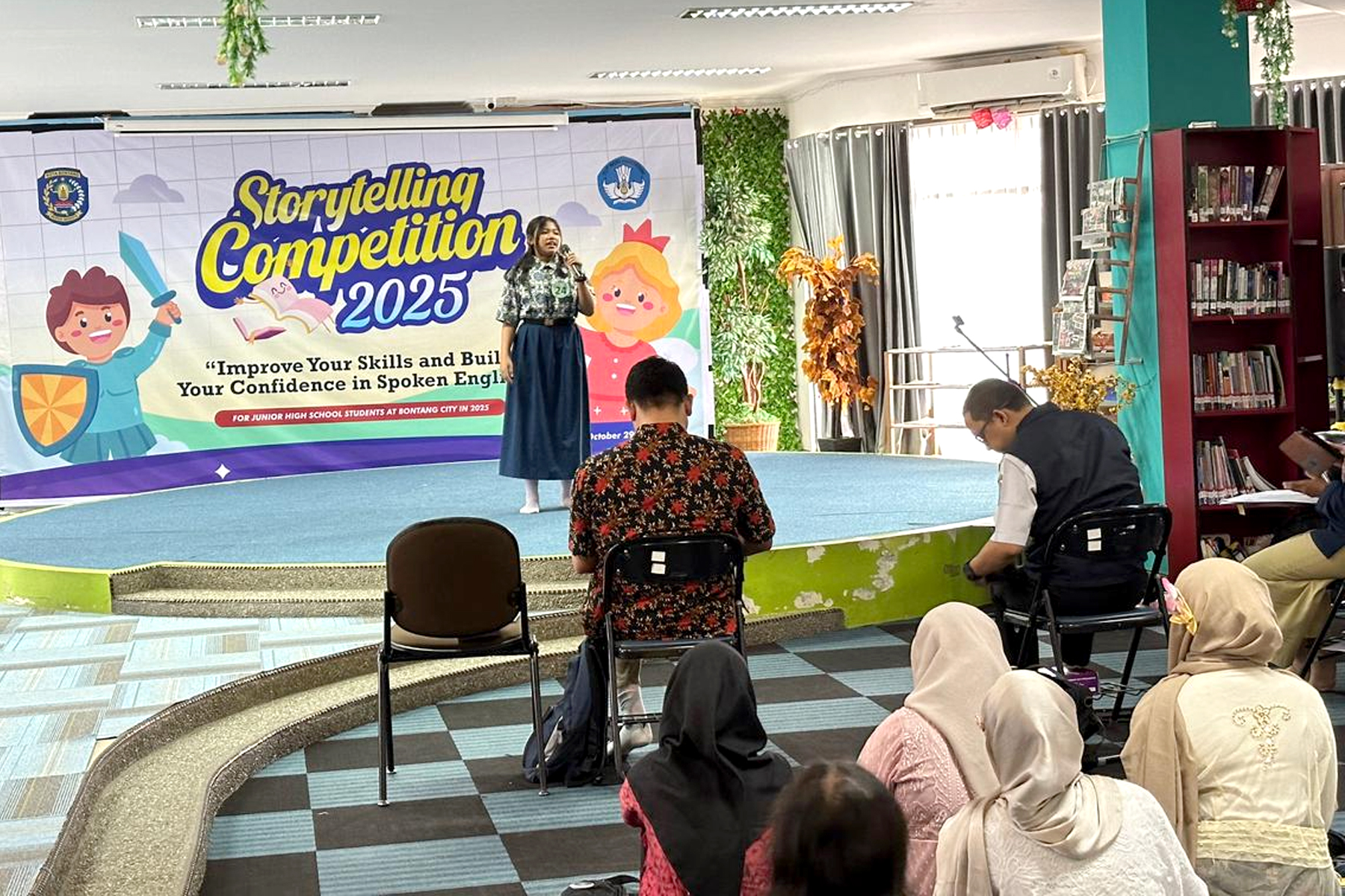 Penampilan salah sati peserta Lomba Story Telling Bahasa Inggris di Perpusda Kota Bontan, Rabu (29/10/2025).BONTANG – Setelah beberapa tahun vakum, Dinas Pendidikan dan Kebudayaan (Disdikbud) Kota Bontang kembali menggelar Lomba Story Telling Bahasa Inggris bagi siswa SMP/MTs se-Kota Bontang, Rabu (29/10/2025), di Ruang Santai Dinas Perpustakaan dan Kearsipan (DPK) Kota Bontang.