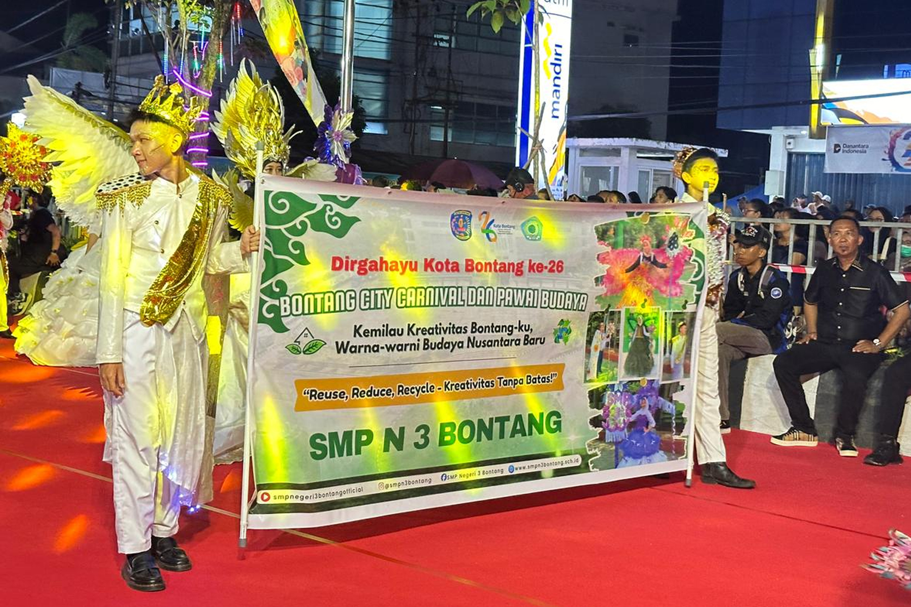 Penampilan siswa-siswi SMPN 3 Kota Bontang.BONTANG – Siswa-siswi SMP Negeri 3 Kota Bontang turut memeriahkan Bontang City Carnival (BCC) yang digelar dalam rangka HUT ke-26 Kota Bontang, Sabtu (25/10/2025), di sepanjang Jalan Jenderal A. Yani.